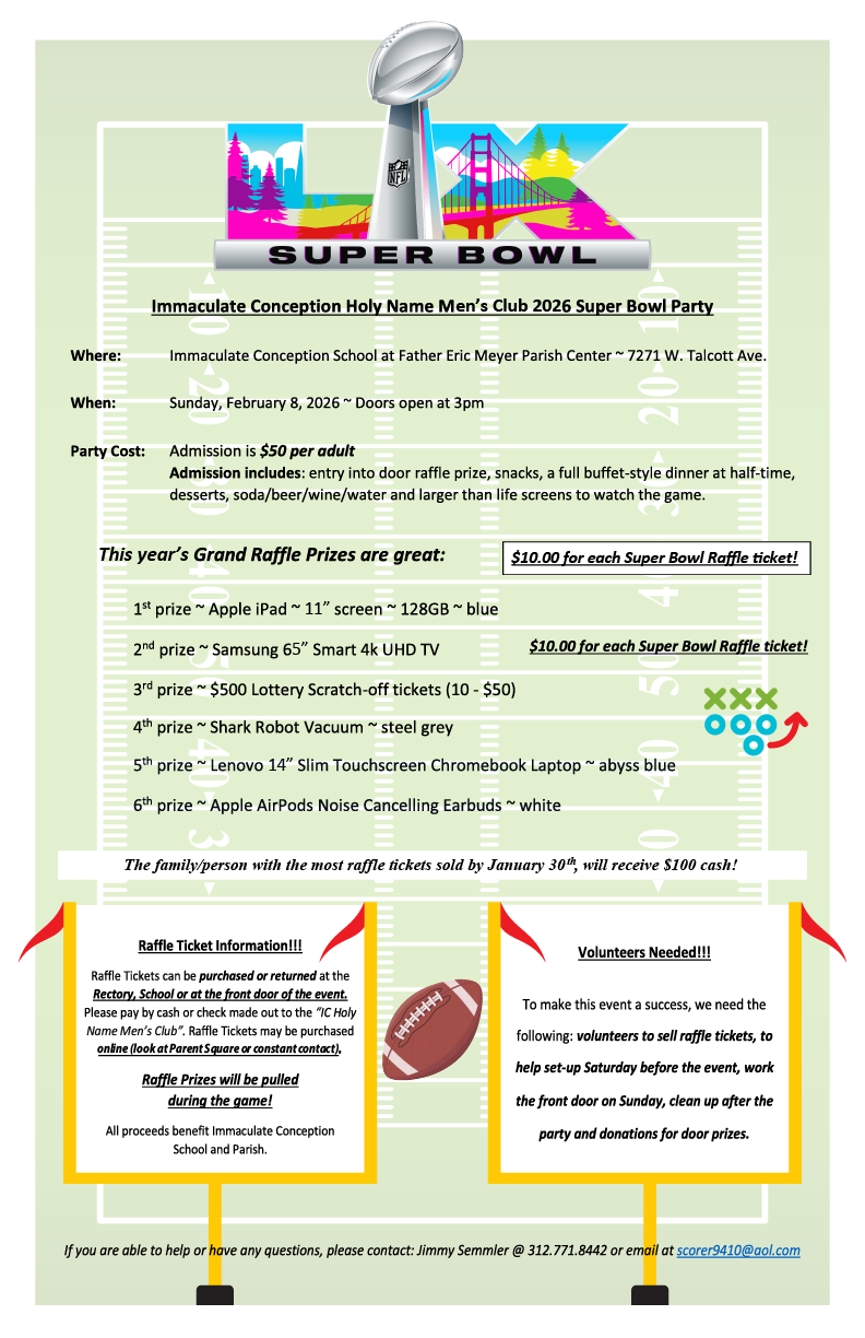 Join our Holy Name Men's Club for their annual Super Bowl Party on Sun. Feb. 8th. Raffle tickets will be available for purchase for $10 after all Masses: 1/31-2/1 & 2/7-2/8