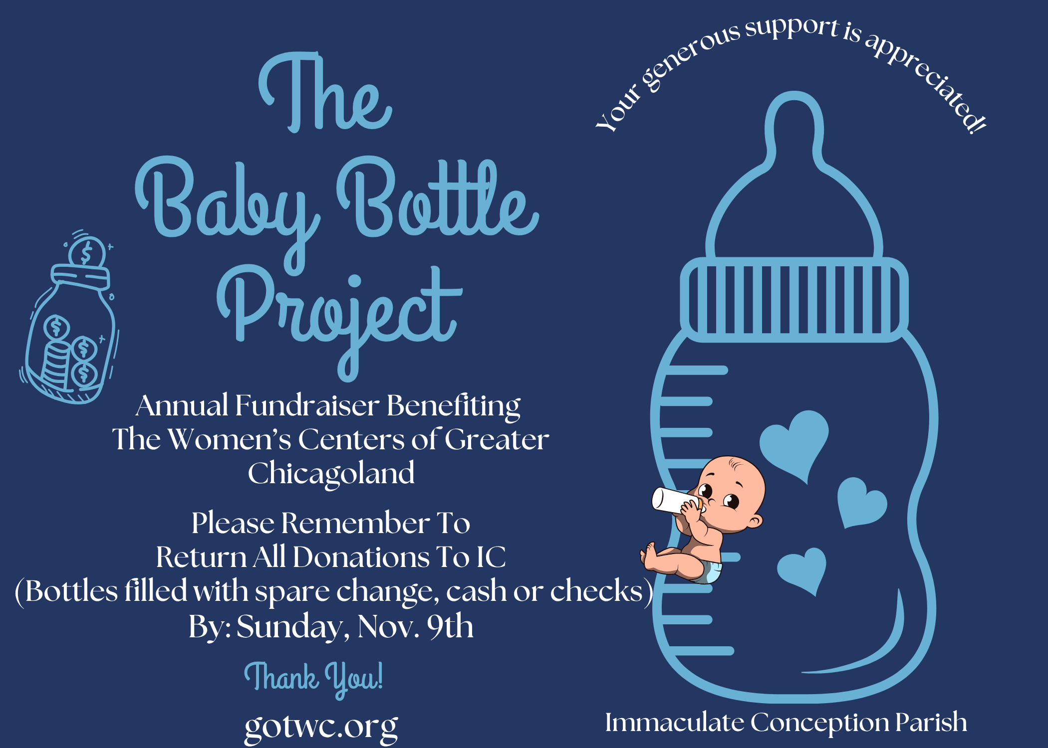 The Baby Bottle Project (benefiting The Women's Center) has concluded @ IC. Please return your baby bottles filled with spare change, cash or checks to our Parish Office.
