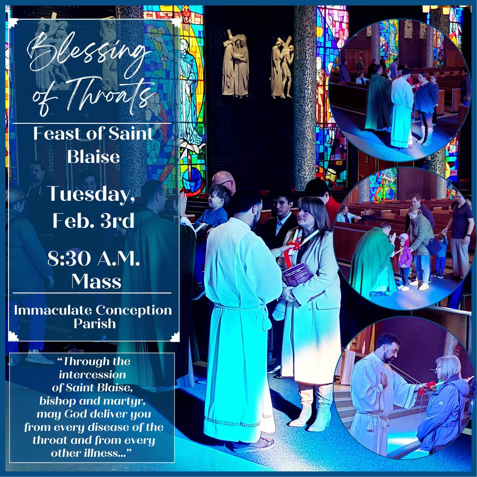 In honor of the Feast of St. Blaise, we will offer our “Blessing of Throats” on Tues., Feb. 3rd @ our 8:30 A.M. Mass.