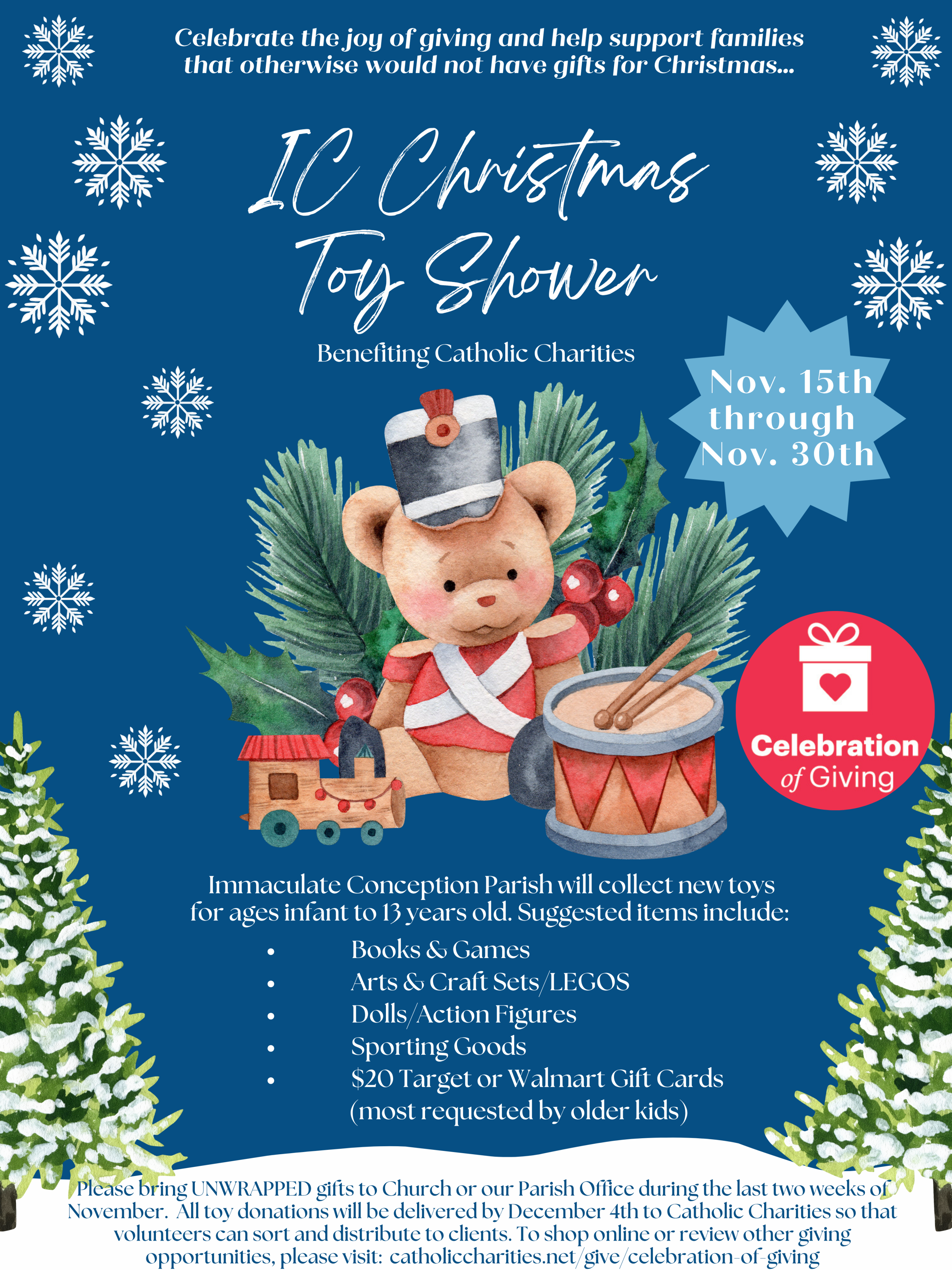 From Nov. 15th through Nov. 30th, IC is hosting a Christmas Toy Shower benefiting Catholic Charities. Please click here for additional details...