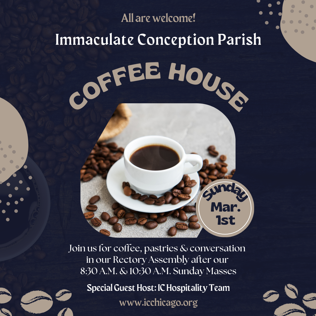 Our hospitality offering, Coffee House, returns March 1st hosted by our IC Hospitality Team. Join us after Mass in our Rectory Assembly for coffee, pastries & conversation!