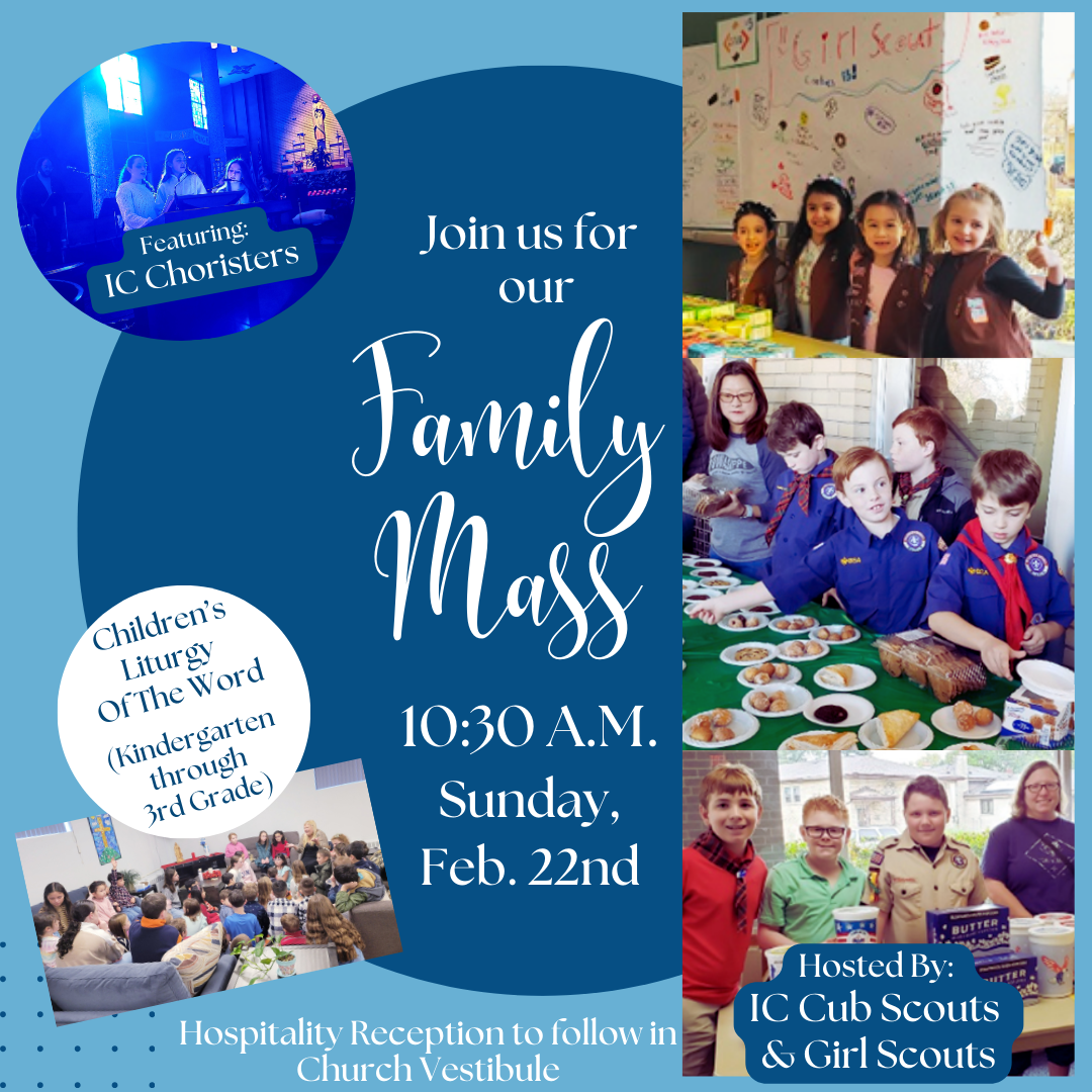 Join us on Sun., Feb. 22nd for our monthly Family Mass @ 10:30 A.M. hosted by our IC Scouts. A hospitality reception will be offered afterward.