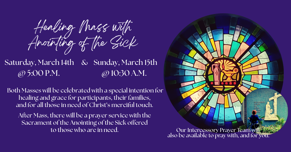 Join us on Sat., Mar. 14th & Sun., Mar. 15th for a special Healing Mass Weekend with Anointing of the Sick (Sacrament offered after 5:00 P.M. & 10:30 A.M. Mass).