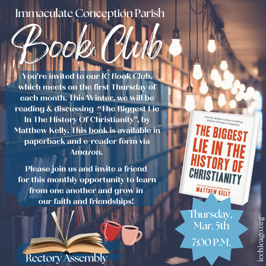 All are welcome to join us for our IC Book Club on Thurs., Mar. 5th @ 7:00 P.M. as we discuss "The Greatest Lie In The History Of Christianity" by Matthew Kelly. Please click ...