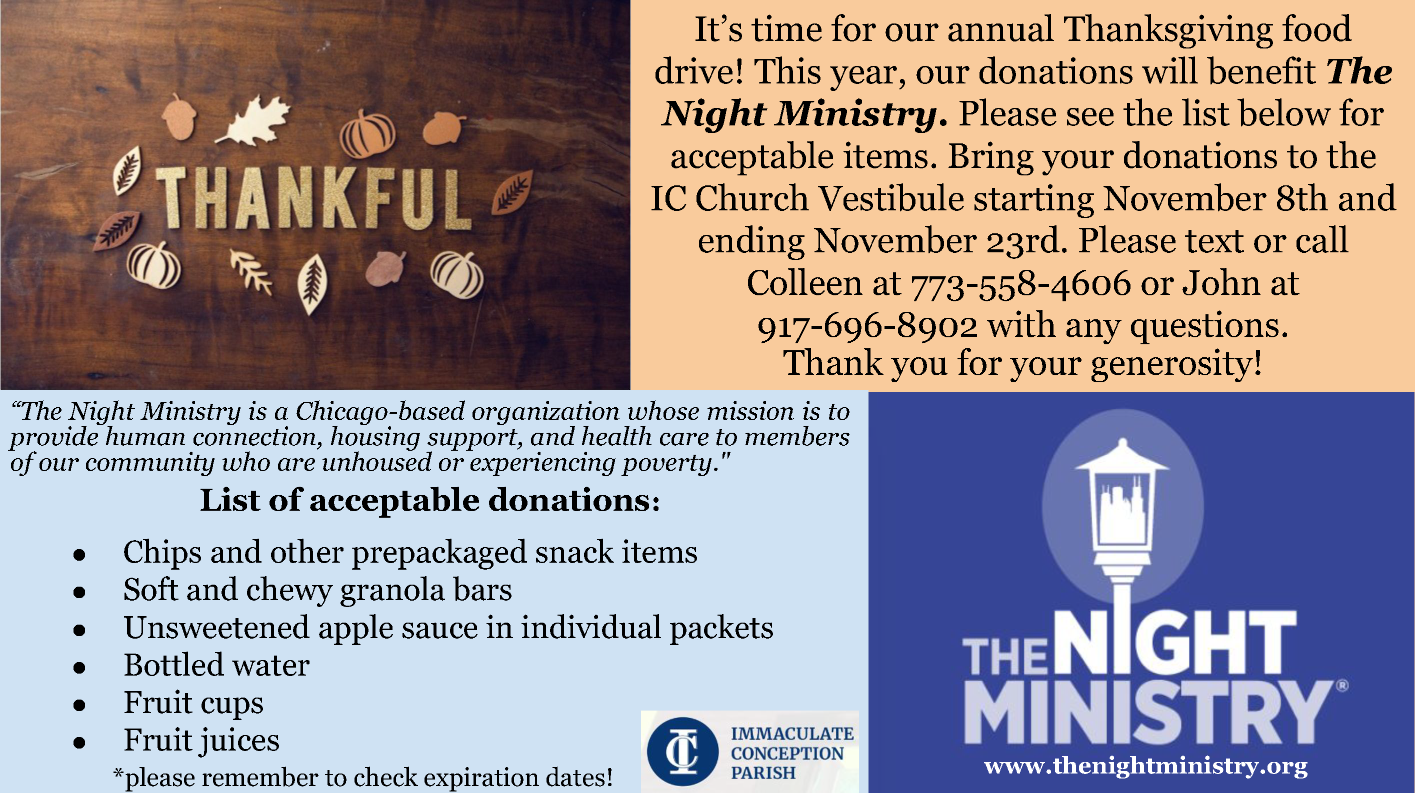From Nov. 8th through Nov. 23rd, IC is hosting a Thanksgiving Food Drive to benefit The Night Ministry. Please click here for additional details...