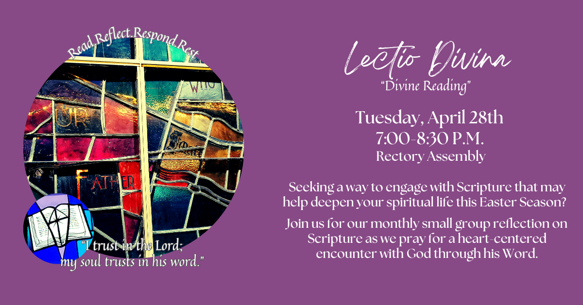 Join us in prayer on Tuesday, Apr. 28th @ 7:00 P.M. in our Rectory Assembly as we host Lectio Divina: a small group reflection on Scripture. All are welcome!