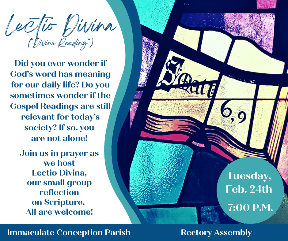 Join us in prayer on Tuesday, Feb. 24th @ 7:00 P.M. in our Rectory Assembly as we host Lectio Divina: a small group reflection on Scripture. All are welcome!