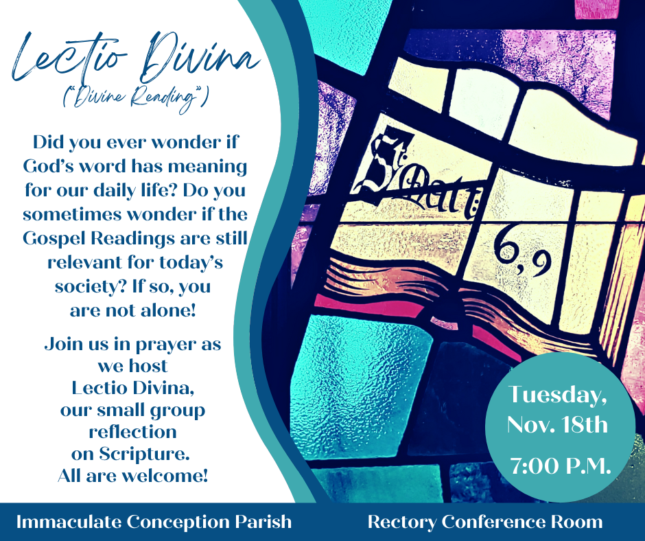 Join us in prayer on Tuesday, Nov. 18th @ 7:00 P.M. in our Rectory Assembly as we host Lectio Divina: a small group reflection on Scripture. All are welcome!