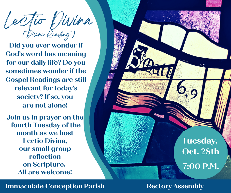 read MoreJoin us in prayer on Tuesday, Oct. 28th @ 7:00 P.M. in our Rectory Assembly as we host Lectio Divina: a small group reflection on Scripture. All are welcome!