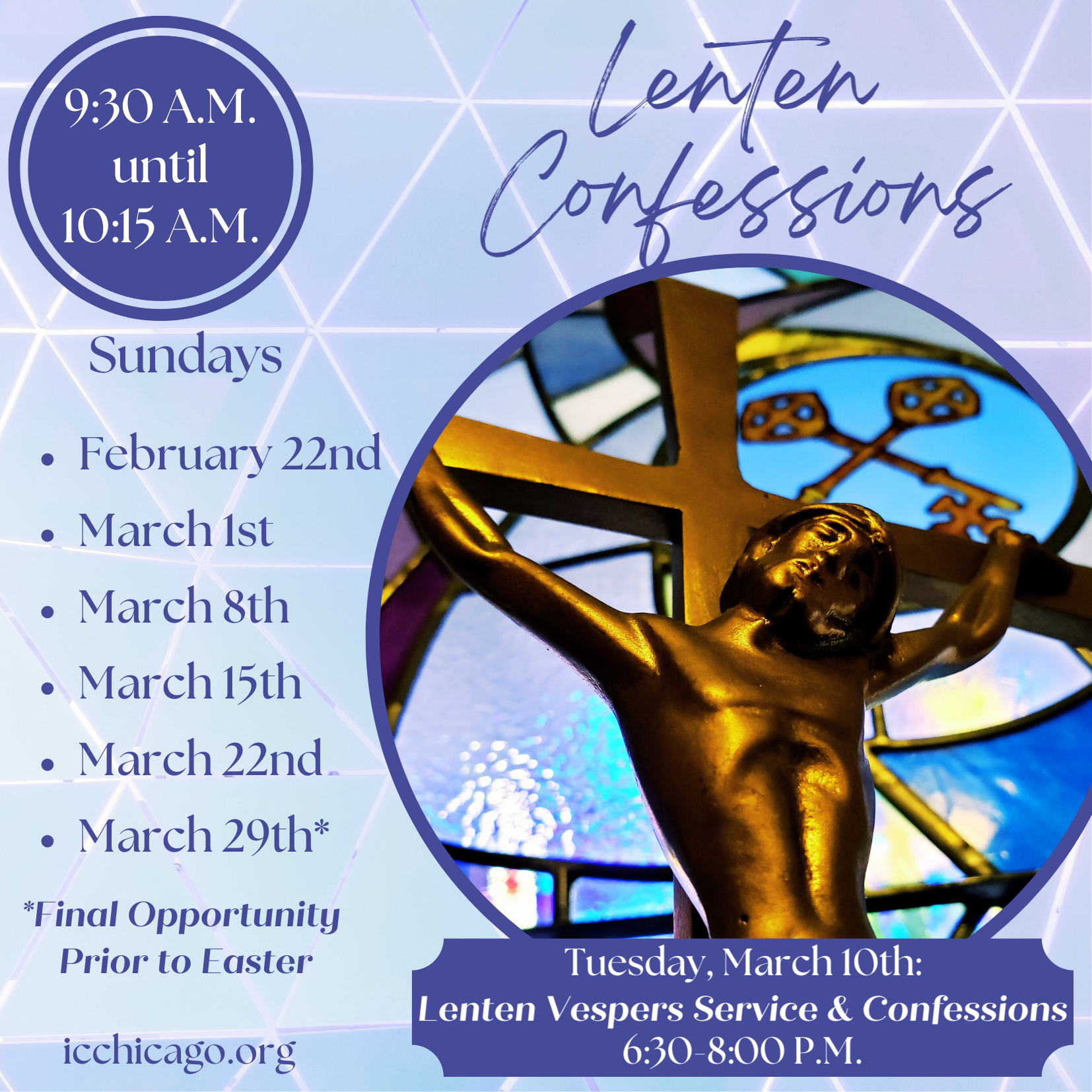 Opportunities for Confessions will be available each Sunday of Lent from 9:30 until 10:15 A.M. March 29th will be the final opportunity prior to Easter.