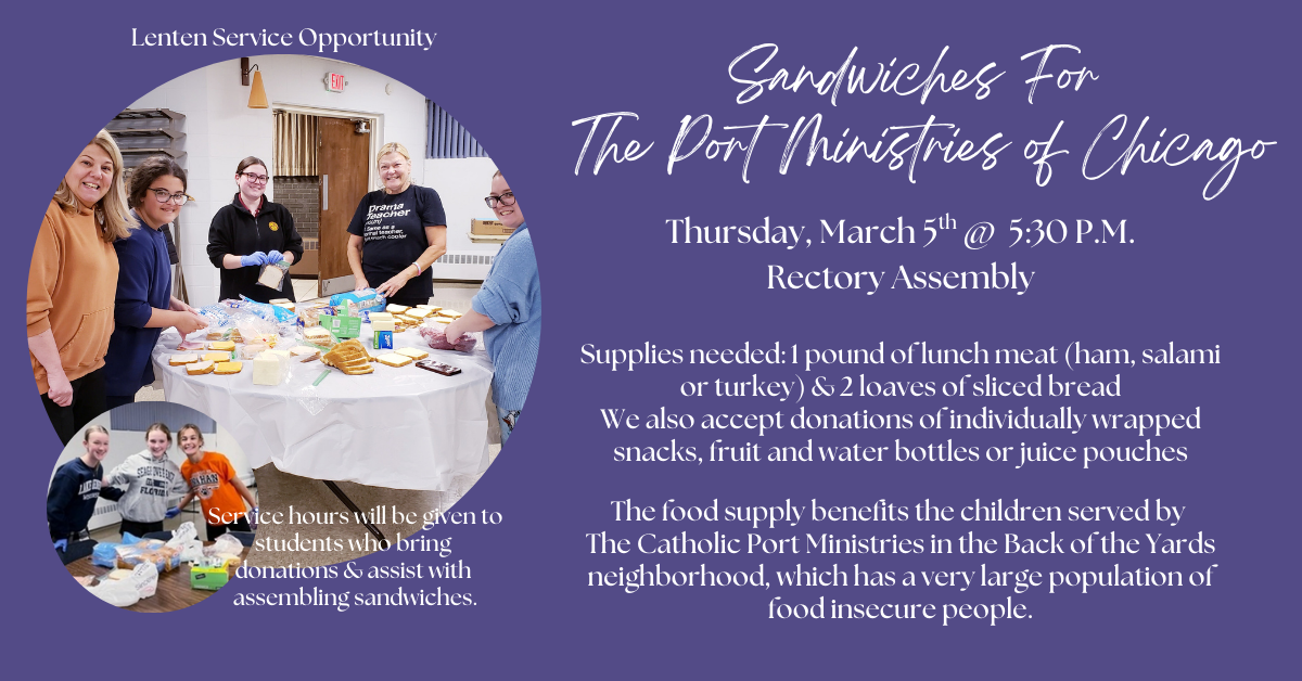 Join us on Thurs., Mar. 5th @ 5:30 P.M. in our Rectory Assembly as we make sandwiches to donate to The Port Ministries of Chicago. Please click here...