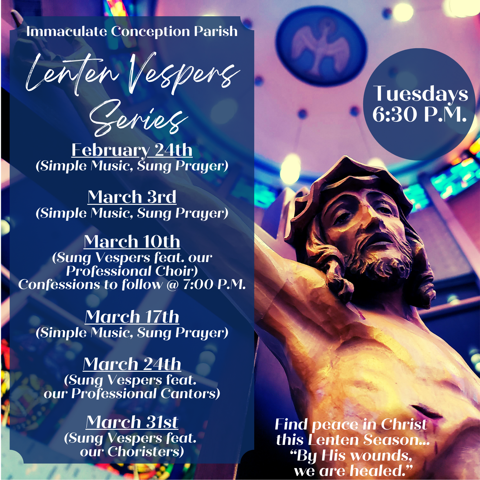 Beginning on Feb. 24th, join us in prayer on Tuesdays @ 6:30 P.M. for our Lenten Vespers Series. All are welcome!