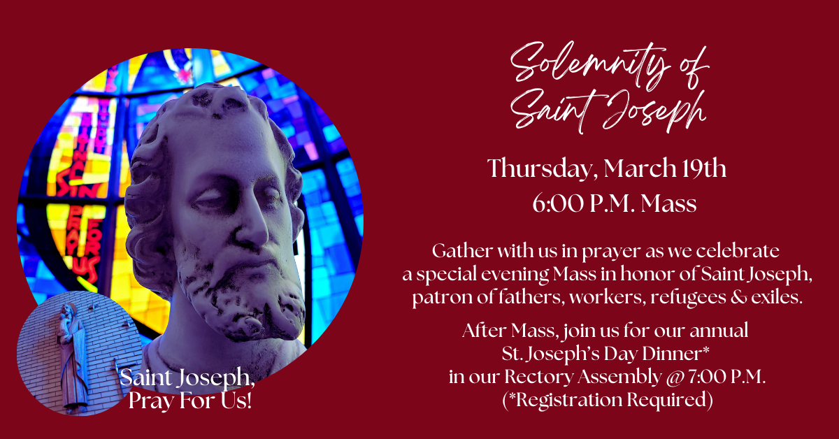 Join us on Thurs., March 19th as we celebrate Mass in honor of St. Joseph @ 8:30 A.M. & 6:00 P.M.