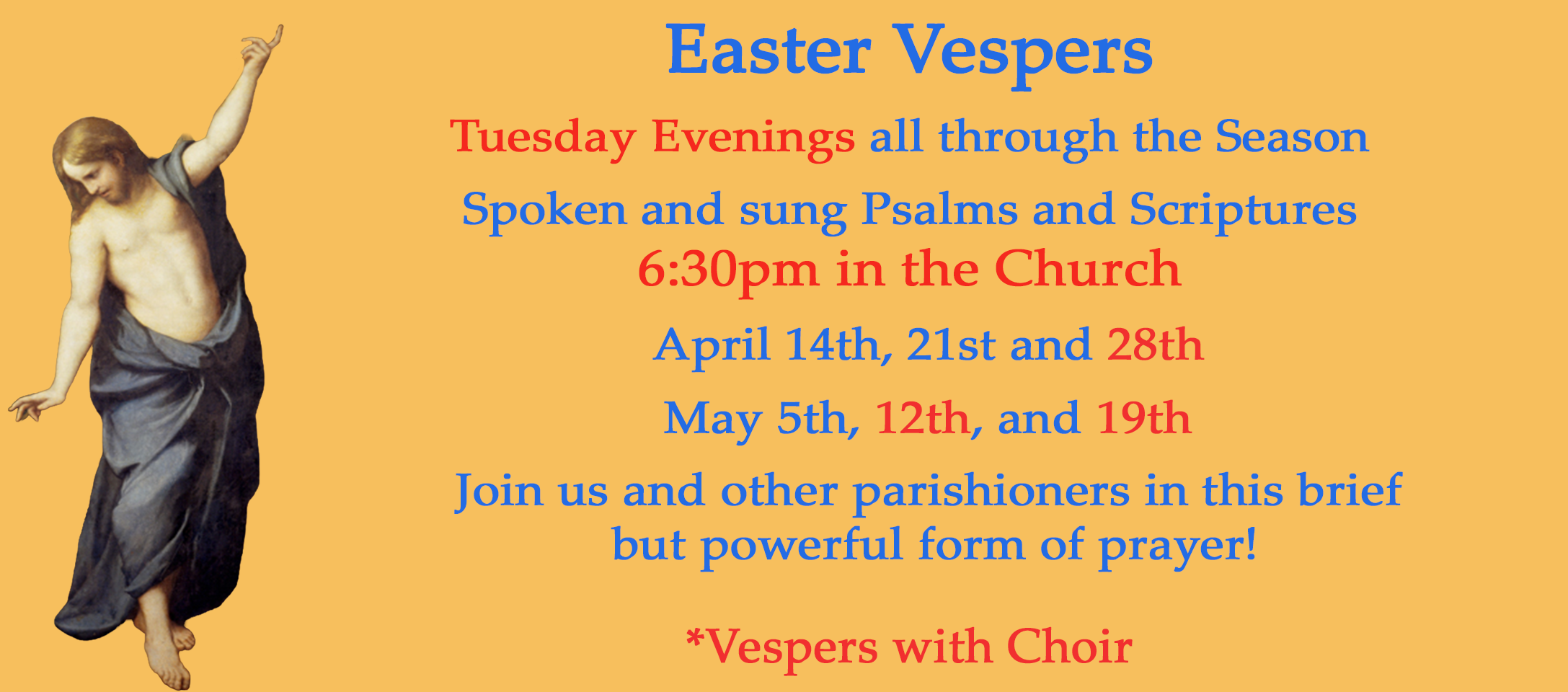 Join us in prayer on Tuesdays @ 6:30 P.M. for our Easter Vespers Series. All are welcome!